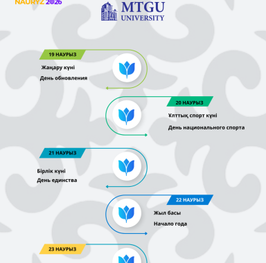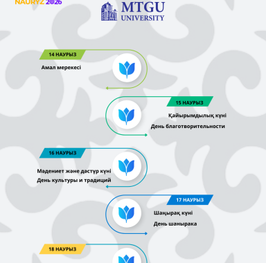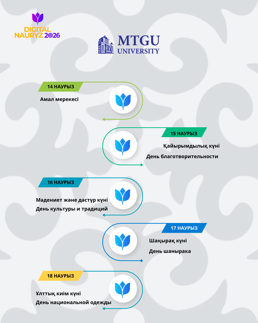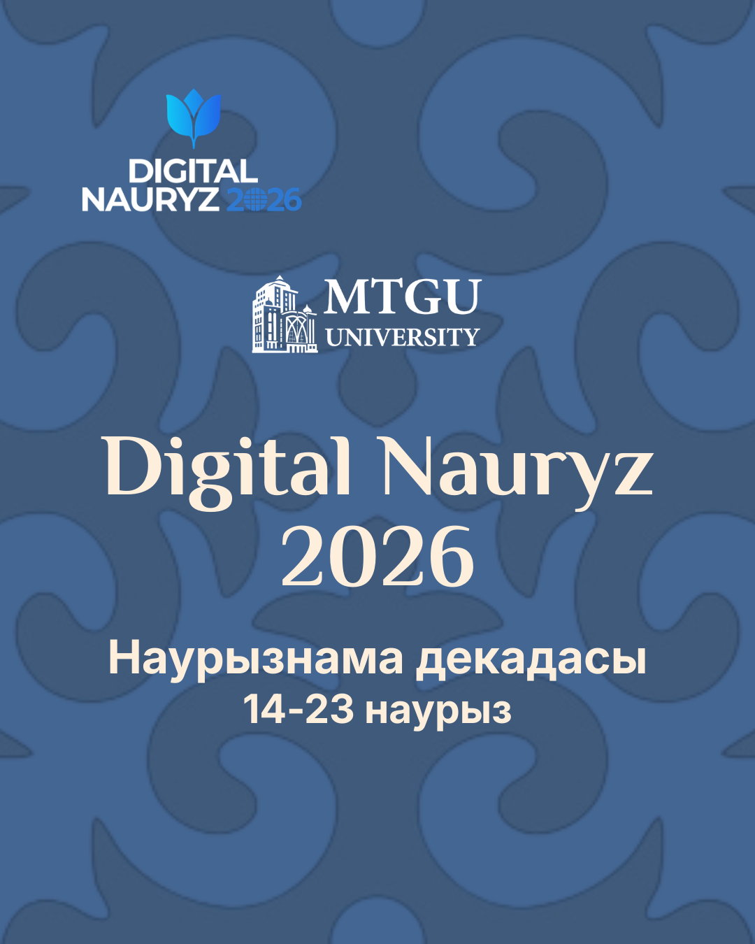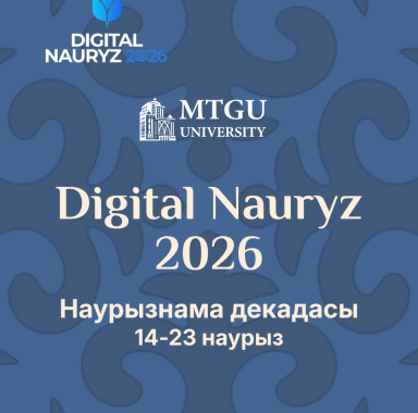 Баршаңызды «Digital Nauryz – 2026» мерекесіне арналған онкүндік іс-шараларға қатысуға шақырамыз! Бұл күндері ұлттық дәстүрлерімізді насихаттайтын мәдени бағдарламалар, шығармашылық байқаулар, студенттік бастамалар мен онлайн форматтағы қызықты жобалар ұйымдастырылады.