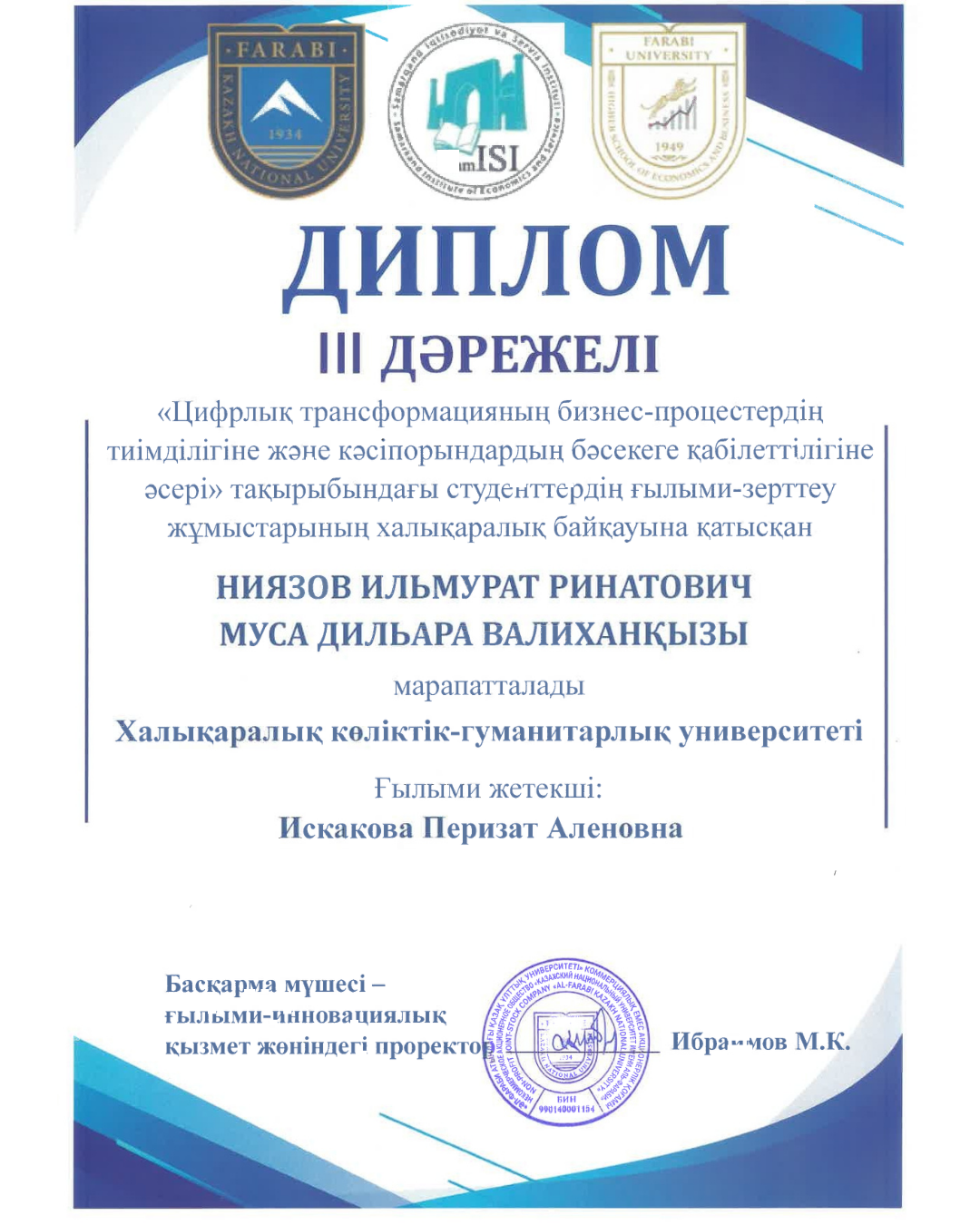 Дипломом III степени награждены: Ниязов Ильмурат Ринатович Муса Дильара Валиханкызы