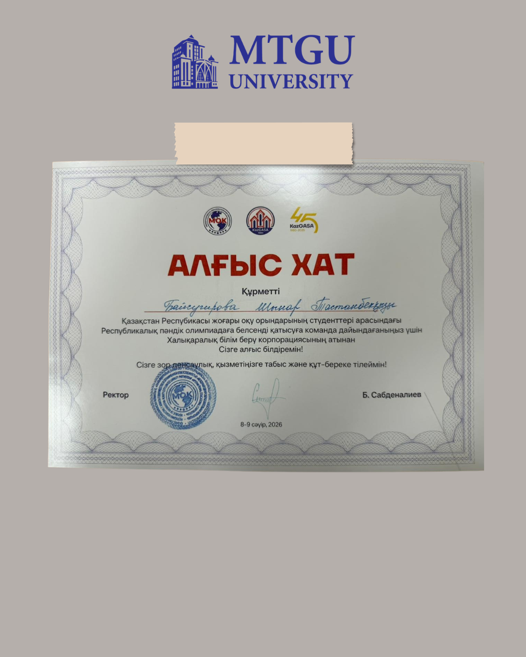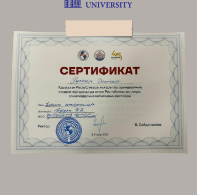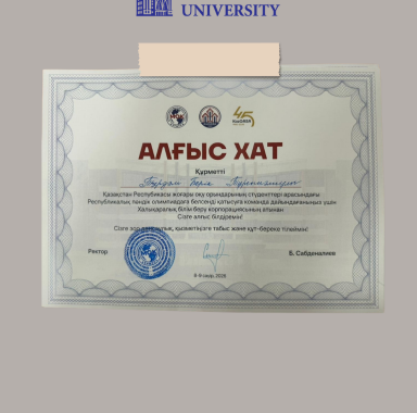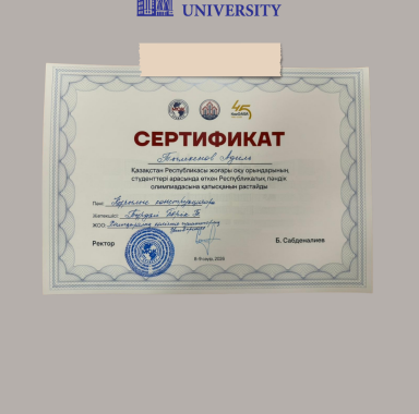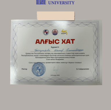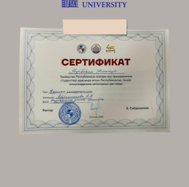 Университет атынан студенттер аға оқытушы Тұрдәлі Берік Тұрсынәлиұлының жетекшілігімен қатысты: • Тылекенов Адиль Адылетович; • Рүстем Дастан Рүстемұлы; • Нурберген Жаннұр Нурымқызы.