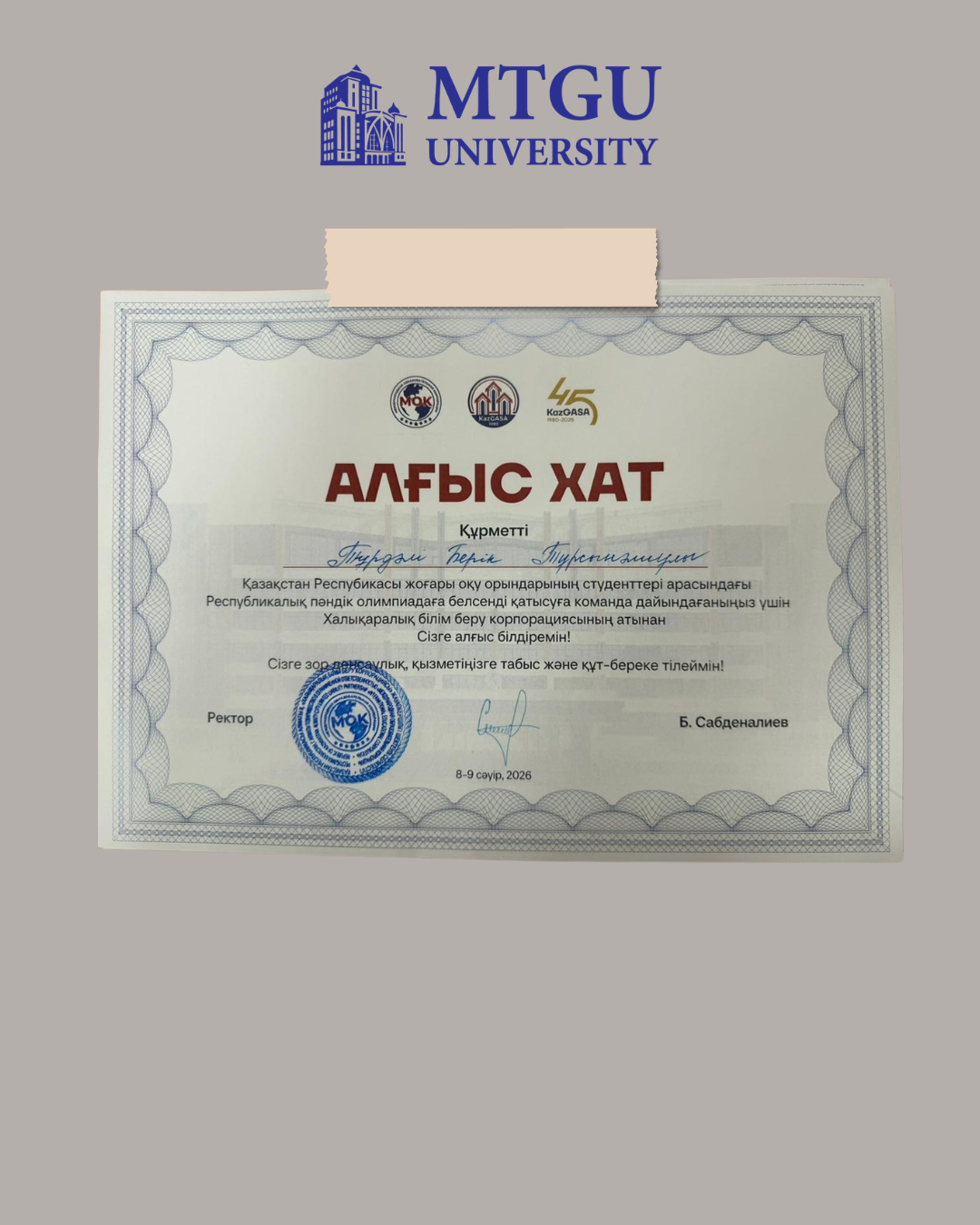 Олимпиаданы жоғары деңгейде ұйымдастырғаны, тәжірибе алмасуға қолайлы жағдай жасағаны және дарынды жастарды қолдағаны үшін «Халықаралық білім беру корпорациясы» ЖШС-на (https://iec.edu.kz) алғысымызды білдіреміз.