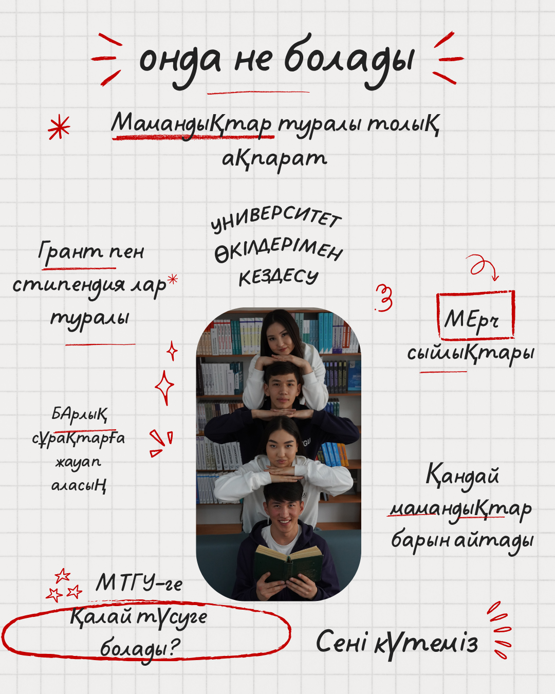 ✨ Университет өкілдерімен тікелей кездесу ✨ Мамандықтар туралы толық әрі нақты ақпарат ✨ Гранттар, жеңілдіктер және түсу шарттары жайлы мәлімет ✨ Барлық сұрақтарыңа нақты жауап ✨ Мерч сыйлықтары мен тосынсыйлар