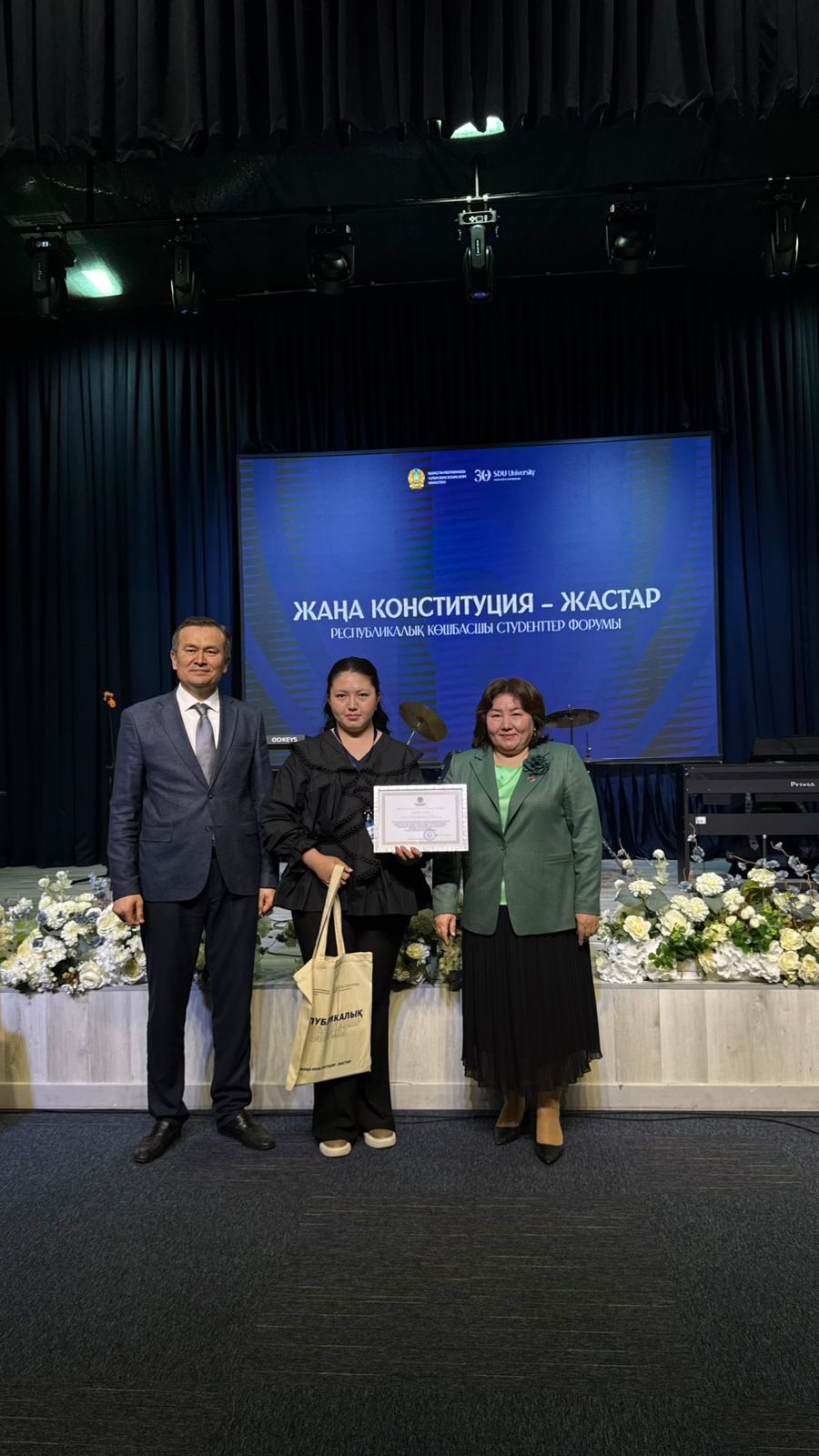Жаңа конституция-Жастар Республикалық көшбасшы студенттер форумында ХКГУ белсенді студенті Дәулетжанқызы Назерке Қазақстан Республикасының Ғылым және жоғары білім министрінің алғыс хатын алды, құттықтаймыз.