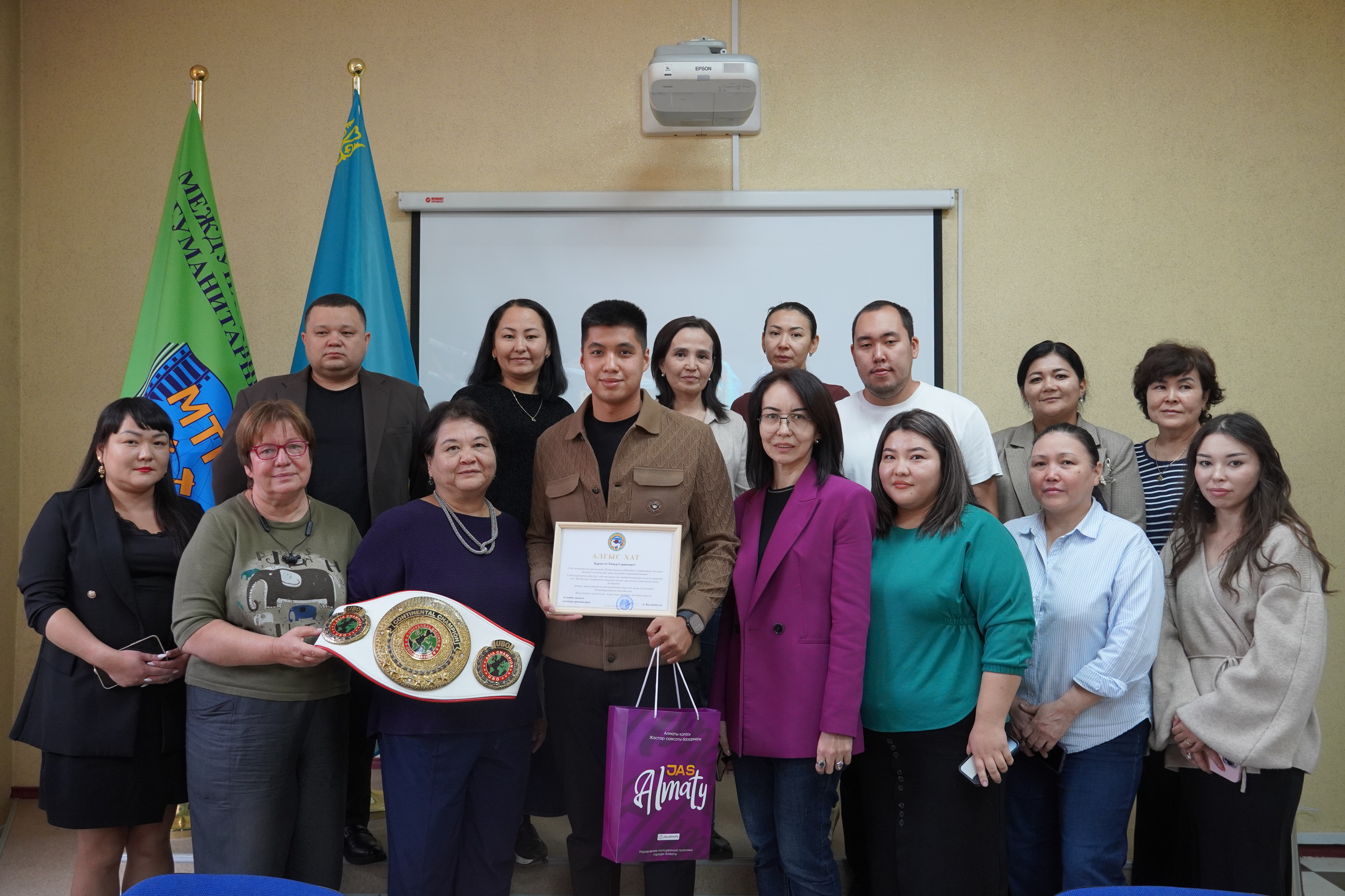 Алматы қаласы әкімінің орынбасары А. Қалдыбеков біздің студентіміз, чемпион Тимур Баситовты арнайы құттықтап, алғыс хатпен марапаттады.