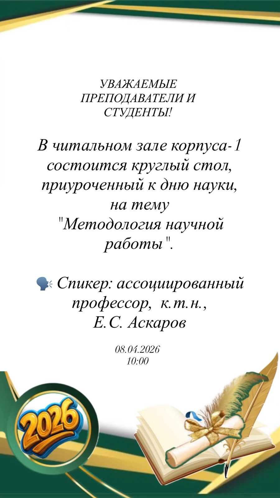 Уважаемые преподаватели и студенты 10:00, 08.04.2026г. В читальном зале корпуса-1 состоится круглый стол, приуроченный к дню науки, на тему "Методология научной работы". Спикер: ассоциированный профессор, к.т.н., Е.С. Аскаров